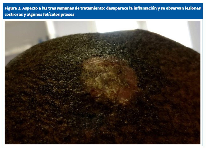 | Figura 2. Aspecto a las tres semanas de tratamiento: desaparece la inflamación y se observan lesiones costrosas y algunos folículos pilosos |