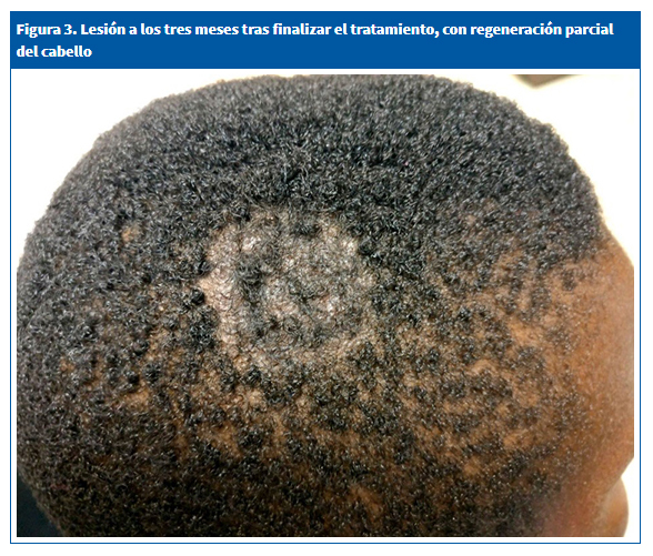 | Figura 3. Lesión a los tres meses tras finalizar el tratamiento, con regeneración parcial del cabello |