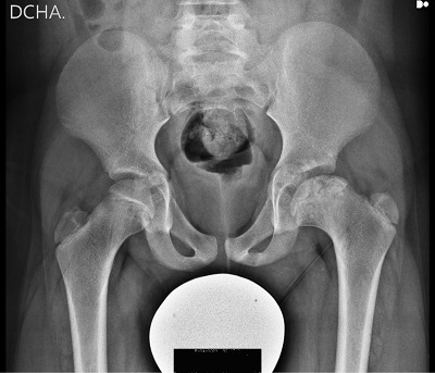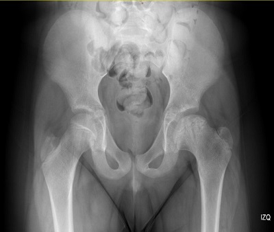 | Figura 1. Hiperlucencia de la epífisis de la cabeza femoral izquierda con reducción del grosor epifisiario y fragmentación parcial |