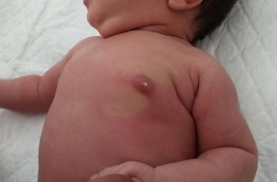 Neonato de 30 días de vida que en revisión rutinaria en su Centro de Salud se objetiva en la exploración tumefacción mamaria bilateral de consistencia dura a la palpación, bien delimitada, móvil, sin enrojecimiento ni calor local, no impresiona de dolorosa, que se acompaña de secreción líquida blanquecina a través del pezón derecho (Figura 1). Antecedentes perinatales sin interés.