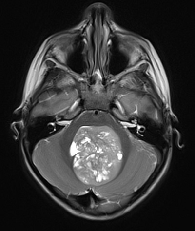 | Figura 1. RMN craneomedular que objetiva RMN craneal: una masa de 5 cm de diámetro localizada en el cuarto ventrículo, moderada hidrocefalia y edema transependimario acompañante, sugestiva de meduloblastoma |