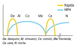 Se administra NPH e insulina regular o AAR antes del desayuno, comida y cena. Las dosis de insulina intermedia deben estar separadas al menos 6-7 horas.