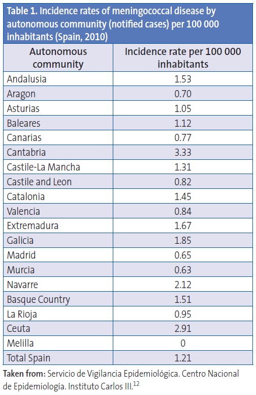 Incidence rates vary across the various autonomous communities in Spain. In the 2006–2007 period, some autonomous communities had incidence rates of up to 4.19 cases per 100 000 inhabitants, and in 2009–2010 some reached rates of up to 3.33 per 100 000 inhabitants.12,13Table 1 shows the incidence rates for 201012.