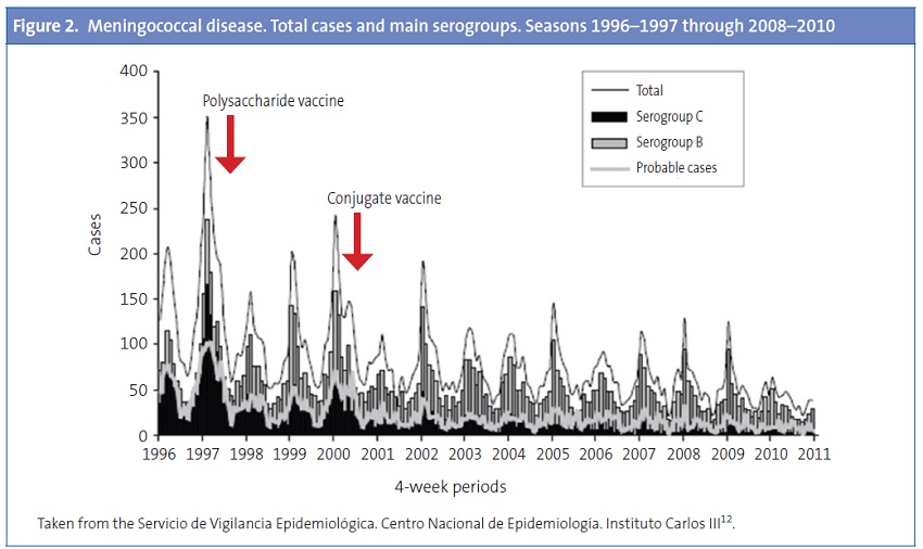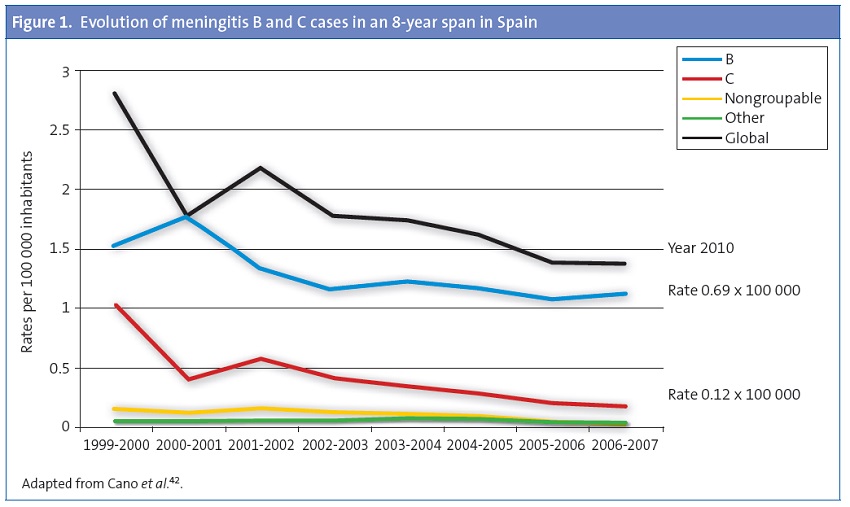 Specific data from European countries, such as the United Kingdom, the Netherlands, or Spain, demonstrate this fact. In the United Kingdom, the use of the conjugate vaccine against meningococcus C (introduced in its routine childhood immunisation schedule in 1999, including a catch-up dose to be given at up to 18 years of age) was associated with a significant and sustained reduction of invasive meningococcal disease caused by this serogroup, with rates of only 0.02 per 100 000 inhabitants (a reduction from 955 cases to 13) in the 2008–2009 period.36,38