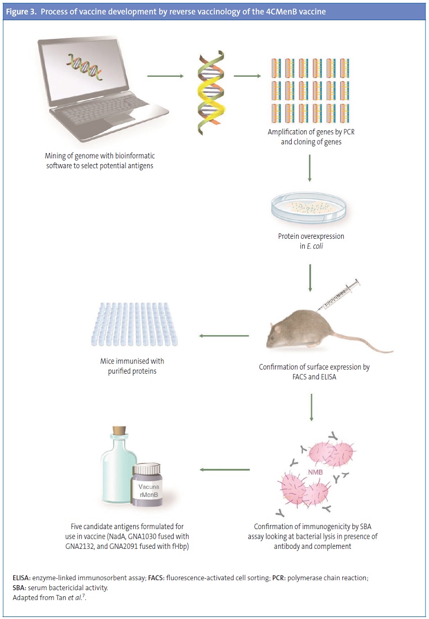 Of these 28 antigens, a few were highly conserved in a group of MenB strains and were immunoreactive to sera from convalescent patients with meningococcal disease. The selected antigens were prioritised based on their ability to induce broad protection as inferred by SBA or observed in passive protection in the infant rat or mouse protection assays. The three antigens that met these criteria were the neisserial heparin-binding antigen (NHBA), and genome-derived neisserial antigens: GNA2132, GNA1870 or fHbp, and GNA1994 or neisserial adhesin A (NadA). Two additional antigens, GNA1030 and GNA2091, were included because they induced protective immunity in some assays, and fused to NHBA and fHbp, respectively. Still, none of them induced a broad enough protective response to cover all tested strains. Since the combination of several antigens in a single vaccine confers enhanced protection, the key antigens were combined into a multicomponent vaccine.60Figure 3 shows the process of vaccine development.