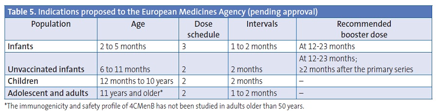 Results: 4 CMenB vaccine, based on four components (NadA, fHbp, NHBA and OMVnz), was designed by reverse Vaccinology. The Meningococcal Antigen Typing System shows a potential of 70-80% coverage of the strains in Europe. Clinical trials show that the vaccine is safe and immunogenic in infants, children, adolescents, and adults, and induces an anamnestic response. The incidence of fever is similar to systemic vaccines administered alone, but higher when coadministered with them, although the fever pattern is predictable and self-limited.