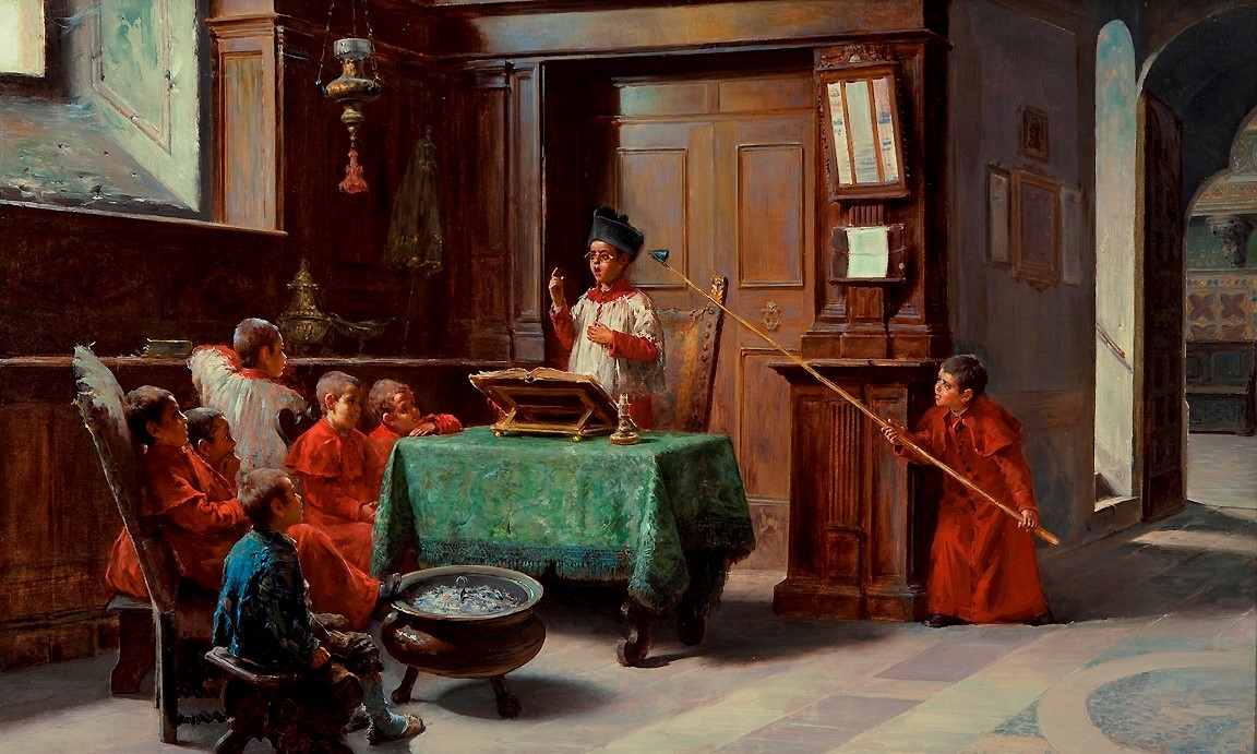 Su autor, Francesco Bergamini (1880-1915), se especializó en las escenas de interior, preferiblemente de temática religiosa. En este cuadro podemos apreciar cómo, más allá de su academicismo formal, el autor se deja llevar por el influjo colorista del impresionismo. Fíjense en los atrevidos rojos, verdes y azules, tan alejados de los tonos sombríos que suelen acompañar las estampas eclesiásticas.