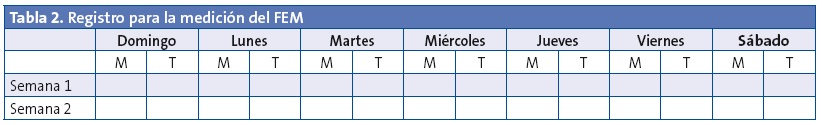 Tras conocer cuál es la medida de FEM mejor o con el porcentaje del FEM teórico del paciente, se calculan sus zonas y se trazan en su diario de FEM. Se puede utilizar el FEM medio del paciente. Esto puede ayudar a comparar en el futuro cómo evoluciona su asma mediante el sistema de semáforo con tres niveles: zona verde, amarilla y roja (Tabla 4).
