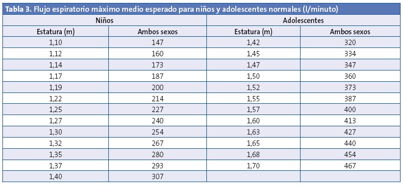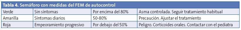 Los planes de acción pueden incluir la medición del FEM para monitorizar la función pulmonar (Tablas 2 y 3). Estos PAE no se utilizan en todos los niños asmáticos, se recomiendan en asma mal controlado y casos de malos perceptores de síntomas, sobre todo adolescentes. Esto se debe a que los planes de acción basados solo en síntomas son más sencillos de realizar, lo que puede facilitar el seguimiento del registro de síntomas.
