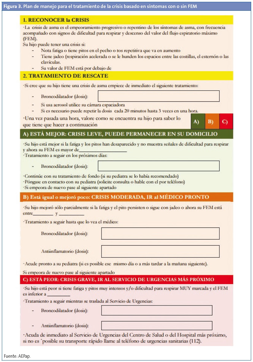 El objetivo es que se actúe precozmente ante una crisis de asma con autonomía para iniciar el tratamiento, teniendo en cuenta los síntomas (Fig. 3), la situación del niño y en caso de usar pico de flujo, según los valores de este: