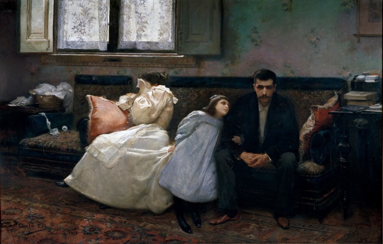 El presente cuadro atrapa, pues nos hace preguntarnos qué diablos ha ocurrido en esa habitación oscura. ¿Ha habido una discusión entre la pareja, y la niña hace de mediadora? ¿Ha ocurrido una desgracia familiar? ¿El padre ha perdido el trabajo, y por eso se le ve tan ensimismado? ¿La niña consuela o concilia? Yo me inclino por lo segundo: sin dejar de asir el vestido blanco de la mamá, coge con su brazo el del papá. Los amantes de la pintura nos deleitamos con las resonancias dejadas por las obras del realismo, y de la transición entre los siglos XIX y XX.