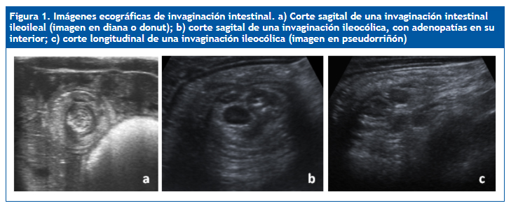 | Figura 1. Imágenes ecográficas de invaginación intestinal: a) corte sagital de una invaginación intestinal ileoileal (imagen en diana o donut); b) corte sagital de una invaginación ileocólica, con adenopatías en su interior; c) corte longitudinal de una invaginación ileocólica (imagen en pseudorriñón) |