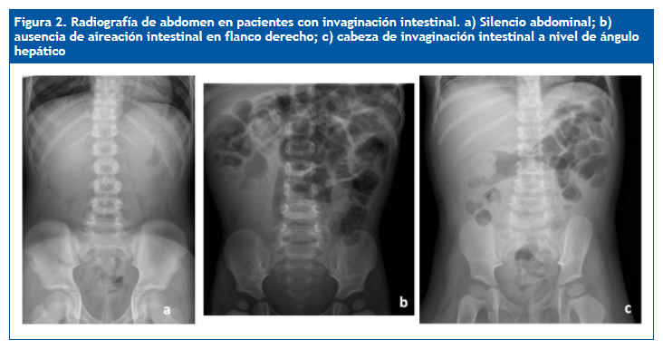 | Figura 2. Radiografía de abdomen en pacientes con invaginación intestinal: a) silencio abdominal; b) ausencia de aireación intestinal en flanco derecho; c) cabeza de invaginación intestinal a nivel de ángulo hepático |