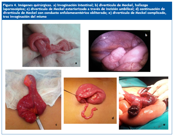 | Figura 4. Imágenes quirúrgicas: a) invaginación intestinal; b) divertículo de Meckel, hallazgo laparoscópico; c) divertículo de Meckel exteriorizado a través de incisión umbilical; d) continuación de divertículo de Meckel con conducto onfalomesentérico obliterado; e) divertículo de Meckel complicado, tras invaginación del mismo |