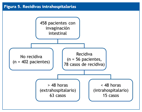 Se registraron 78 recidivas en 56 pacientes (12,2% de los casos, rango 1-4), con un intervalo medio de tiempo desde el primer episodio de 173,4 días (DE 284,7, rango 0-1292). Se registraron 15 casos (19,2%) intrahospitalariamente, 11 pacientes con una única recidiva y dos pacientes con dos episodios (Fig. 5). Se empleó neumoenema como tratamiento inicial en el 90% de las primeras recidivas y el 81,8% de las segundas. No hubo complicaciones derivadas de este procedimiento ni se registró ningún exitus.
