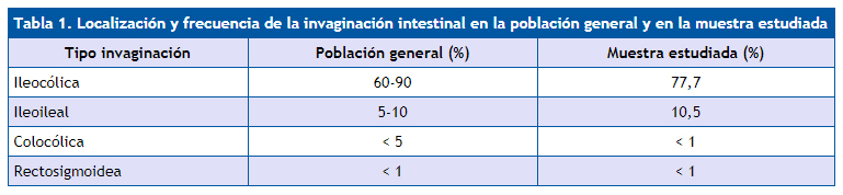 La muestra de pacientes obtenida en nuestro estudio tiene una edad media y distribución por sexos coincidente con lo descrito en la literatura médica (la mayoría varones, menores de tres años). Lo mismo ocurre en cuanto a la localización de la invaginación, de predominio en situación ileocólica, y el porcentaje de pacientes en los que se encuentra causa secundaria de invaginación (2,4%).