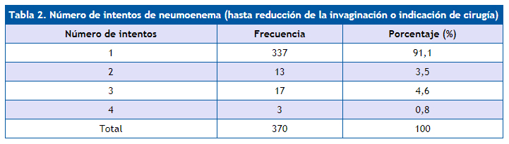 | Tabla 2. Número de intentos de neumoenema (hasta reducción de la invaginación o indicación de cirugía) | ||