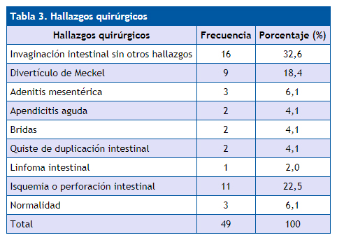 | Invaginación intestinal sin otros hallazgos | 16 | 32,6 |