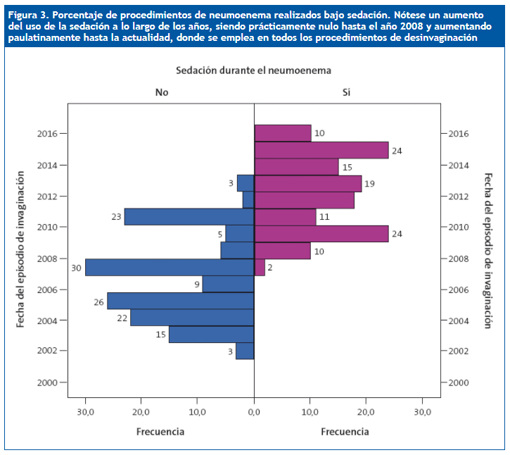 De forma general, a lo largo de los años que abarca el estudio, se empleó sedación durante el procedimiento en el 48,2% de los pacientes. No obstante, analizando los episodios registrados por años, puede verse que en los últimos cinco el porcentaje de neumoenemas realizados bajo sedación ha ido en aumento; a partir de 2010 era del 77,8% y a partir de 2013, del 98,3% (Fig. 3).