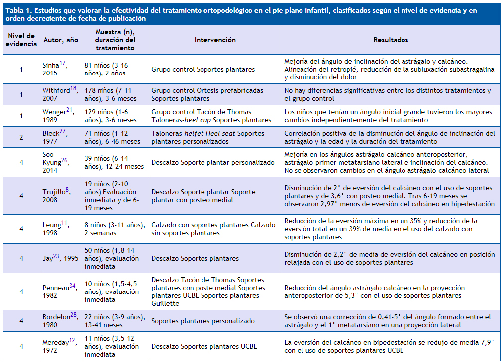 El estudio de Wenger21, con nivel de evidencia 1, realizado en 1989, analizó a 98 niños de uno a seis años, con tres años de media, con pies planos valgos flexibles, con el fin de evaluar si estos pies presentan alguna modificación con la utilización de distintos tratamientos ortopodológicos. A todos los niños se les realizaron radiografías en bipedestación y descalzos en el momento de inicio, a los seis meses y al final de los tres años de tratamiento. Se midieron los ángulos astrágalo-suelo, astrágalo-primer metatarsiano y astrágalo-calcáneo anteroposterior. Se dividió a los niños en cuatro grupos. Veintiún niños formaron el grupo de control (G1), 28 niños fueron tratados con calzado con tacón de Thomas (G2), 27 niños fueron tratados con taloneras (G3) y 22 niños fueron tratados con soportes plantares personalizados (G4). Los grupos G2 y G3 utilizaron el mismo calzado de cuero con tacón de Thomas. El G4 utilizó un calzado de cuero. Los resultados (Tabla 6) mostraron que los niños que tenían pies planos flexibles más graves fueron los que obtuvieron una mejor evolución, independientemente del tratamiento. Estos resultados no especifican si en la medición final los niños llevaban el tratamiento o si todos se realizaron las radiografías descalzos.