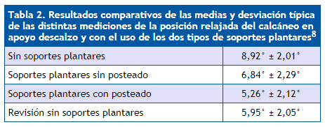 | Tabla 2. Resultados comparativos de las medias y desviación típica de las distintas mediciones de la posición relajada del calcáneo en apoyo descalzo y con el uso de los dos tipos de soportes plantares8 |
