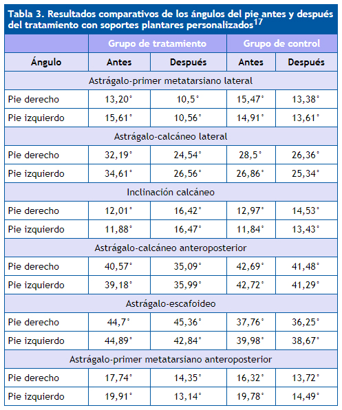 | Tabla 3. Resultados comparativos de los ángulos del pie antes y después del tratamiento con soportes plantares personalizados17 |