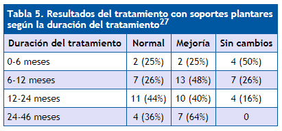 | Tabla 5. Resultados del tratamiento con soportes plantares según la duración del tratamiento27 |