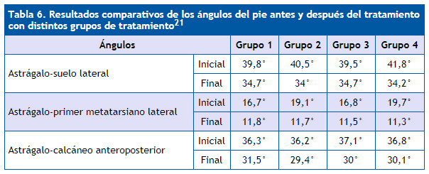 | Tabla 6. Resultados comparativos de los ángulos del pie antes y después del tratamiento con distintos grupos de tratamiento21 |