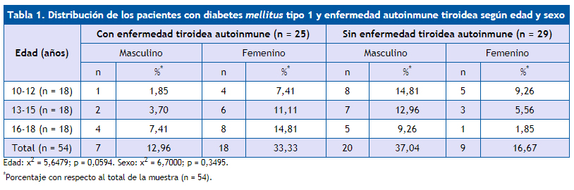 La distribución de los pacientes con DM1 y enfermedad autoinmune tiroidea según edad y sexo se muestran en la Tabla 1. Se observó que 25 (46,29%) pacientes con DM1 presentaron enfermedad tiroidea autoinmune, de los cuales 18 (33,33%) eran del sexo femenino.