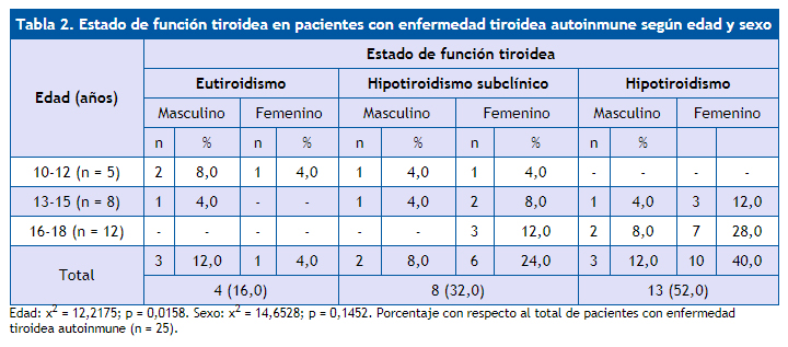 La comparación del estado de la función tiroidea en pacientes con enfermedad tiroidea autoinmune según edad y sexo se muestra en la Tabla 2. Al comparar el estado de la función tiroidea según la edad se encontró que los pacientes con mayores edades presentaron mayor grado de disfunción tiroidea que los pacientes con menores edades, donde, de los 13 pacientes con hipotiroidismo, nueve (36,0%) pacientes eran mayores de 16 años de edad, cuatro (16,0%) tenían entre 13 y 15 años de edad y ningún paciente tenía entre 10 y 12 años de edad. Con respecto al sexo, predominó el sexo femenino, con 17 (68,0%) pacientes.