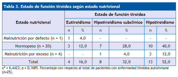 | Tabla 3. Estado de función tiroidea según estado nutricional | ||||||