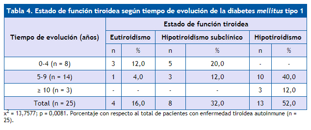 | Tabla 4. Estado de función tiroidea según tiempo de evolución de la diabetes mellitus tipo 1 | ||||||