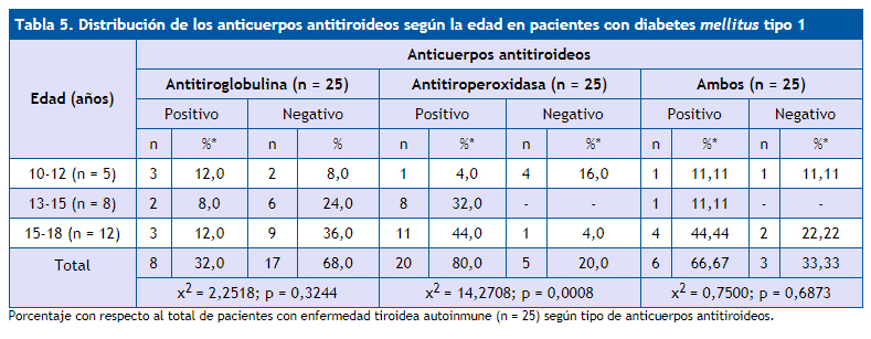 | Tabla 5. Distribución de los anticuerpos antitiroideos según la edad en pacientes con diabetes mellitus tipo 1 | ||||||||||||