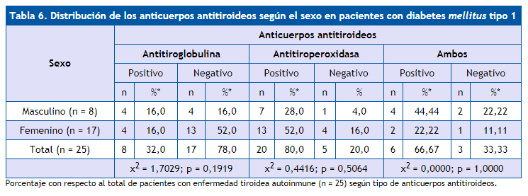 | Tabla 6. Distribución de los anticuerpos antitiroideos según el sexo en pacientes con diabetes mellitus tipo 1 | ||||||||||||