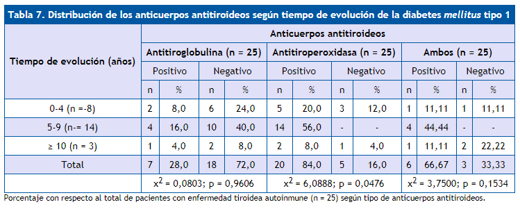 | Tabla 7. Distribución de los anticuerpos antitiroideos según tiempo de evolución de la diabetes mellitus tipo 1 | ||||||||||||