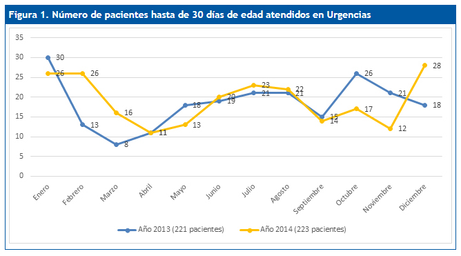 En el servicio de urgencias del HMSD, entre los pacientes pediátricos que atiende, considerados estos hasta los 14 años de edad y con unas cifras totales durante el año 2014 de 8893 de urgencias pediátricas, los recién nacidos suponen cuantitativamente una pequeña proporción (2,56%). Sin embargo, este grupo de edad presenta una serie de peculiaridades que lo diferencia del resto de pacientes pediátricos, consecuencia de la gran ansiedad que generan entre su familia ante cualquier síntoma.