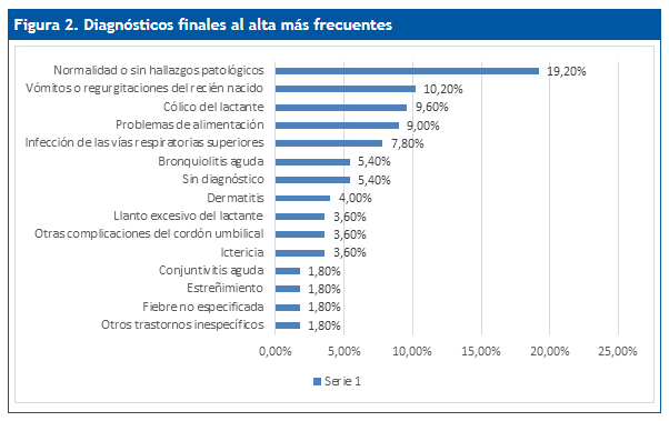En cuanto a los diagnósticos finales al alta, codificados según el CIE.9, destacaron entre los más frecuentes: el 19,20%, normalidad o sin hallazgos patológicos; el 10,20%, vómitos o regurgitaciones del recién nacido; el 9,60%, cólico del lactante; el 9%, problemas de alimentación; el 7,8%, infección de vías respiratorias superiores, y se detectó un 5,4% con código CIE sin diagnóstico (Fig. 2).