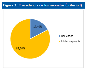 Criterio I (derivación): el 17,36% (n = 29) acudió por derivación otro centro o especialista y el 82,64% de los neonatos (n = 138) acudió por iniciativa de sus progenitores (Fig. 3).