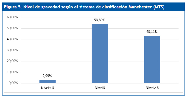 Criterio III (nivel de clasificación según el sistema de clasificación de Manchester [MTS]): encontramos un 3% (n = 5) de neonatos con clasificación de nivel inferior a 3 (1-2), el 53,9% (n = 90) presentó una clasificación de nivel 3, mientras que el 43,1% (n = 72) obtuvo una clasificación de nivel superior a 3 (4-5) (Fig. 5).