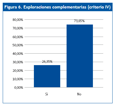 Criterio IV (exploraciones complementarias): el 73,65% (n = 123) de los neonatos no precisó exploraciones complementarias y el 26,35% (n = 44) sí precisó las mismas (Fig. 6).