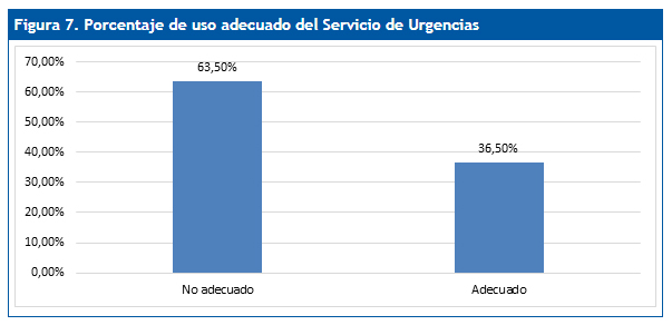 Por tanto, de los 167 neonatos analizados, el 36,5% (n = 61) se clasificó como un uso adecuado del servicio de urgencias, mientras que el 63,50% (n = 106) se catalogó como uso no adecuado del mismo (Fig. 7).