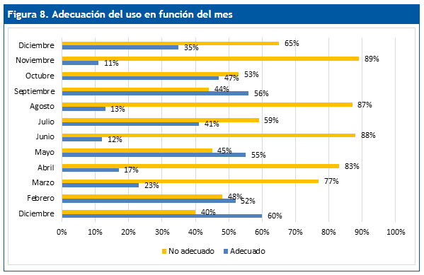 En función del mes en que acudieron, se observan variaciones significativas en la proporción de uso adecuado (test exacto de Fisher, p = 0,024) (Fig. 8).