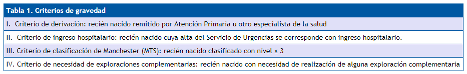 Dado que actualmente no existe un consenso sobre cuál es el concepto de uso adecuado de los servicios de urgencias, este estudio ha establecido el concepto de adecuación de su uso en base a diferentes criterios, como son la necesidad de ingreso hospitalario, la procedencia del neonato (derivación), el nivel de gravedad establecido según el sistema de clasificación de Manchester y la necesidad de exploraciones complementarias.