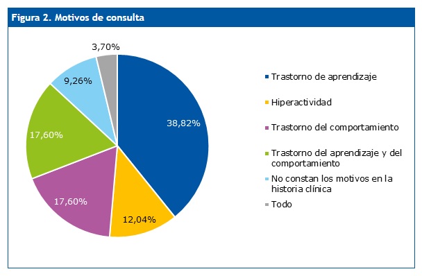 Con respecto a la edad del diagnóstico, la edad media a la que se diagnostica este trastorno es 7,89, siendo la moda los seis años. La frecuencia por edades se muestra en la Fig. 1. El porcentaje de pacientes con TDHA según el motivo de consulta se muestra en la Fig. 2.