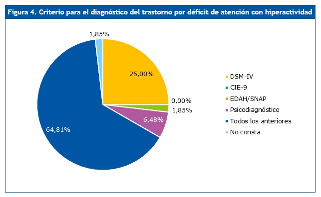 Para tratar de evitar estos problemas de sobre- o infradiagnóstico es importante recalcar la necesidad de conocer y utilizar mejor los diversos instrumentos de diagnóstico, haciendo hincapié en que el DSM-IV y las escalas de valoración del TDAH (Conners y EDAH) se basan solo en criterios categoriales preestablecidos. Son pruebas complementarias, pero no son diagnósticas de forma directa y por ello no deben sustituir en ningún caso a la observación clínica. En este estudio se ha observado que el 64,81% de los pacientes han sido diagnosticados utilizando conjuntamente diversos criterios: el DSM-IV es el criterio más utilizado con un 25%.