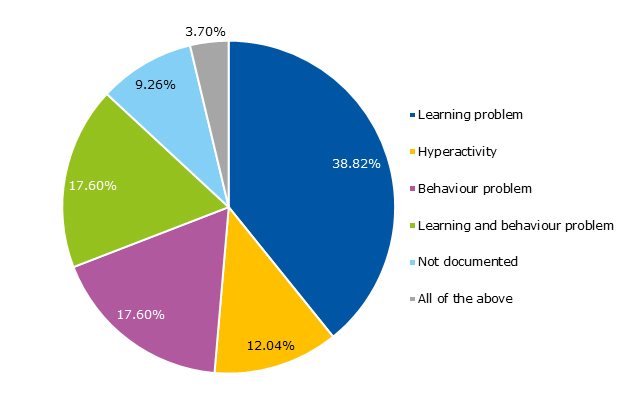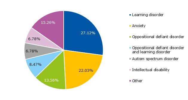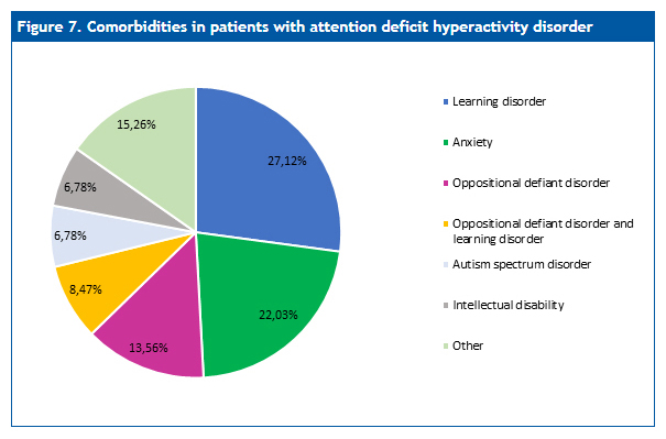 Figure 7 shows the presence and absence of comorbidities. We found the following disorders in the patients that had comorbidities: learning disorders (27.12%), anxiety (22%), oppositional defiant disorder (15.56%), oppositional defiant disorder with learning disorder (8.47%), autism spectrum disorder (6.78%), intellectual disability (6.78%) and other (15%).