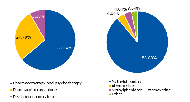 The treatment of ADHD should be multimodal with the coordinated involvement of parents, teachers, therapists and physicians. It should be conducted in a health care setting and employ evidence-based interventions recommended in clinical practice guidelines and individualised for each patient (adapted to the age and needs of the patient, and his or her context). Pharmacological treatment aims to control the core symptoms (inattention, hyperactivity and impulsivity) while psychological and psychoeducational interventions address the behavioural and learning problems resulting from those symptoms.14 In our study, 63.89% of the children were managed with a combination of pharmacological and psychoeducational treatment.
