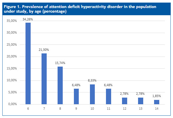 | Figure 1. Prevalence of attention deficit hyperactivity disorder in the population under study, by age (percentage) |