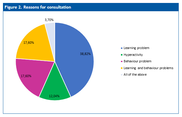 The mean age at the time of ADHD diagnosis was 7.89, and the mode was 6 years. Figure 1 shows the age frequency distribution. Figure 2 shows the distribution of patients with ADHD by reason for consultation.