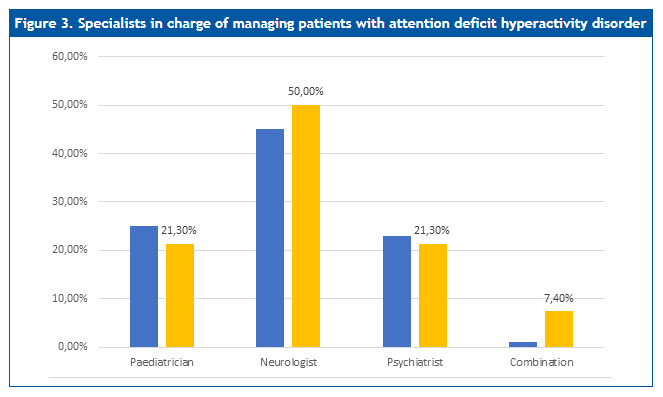 The majority of children in our study were diagnosed and managed by paediatric neurologists, which probably was due to the population under study and the private infrastructures available in this geographical area, combined with the low availability of public mental health services. Still, the percentage of children diagnosed and managed by primary care paediatricians was not small (approximately 28%), which is a relevant finding, as there are not enough paediatric neurologists or even child and adolescent psychiatrists in Spain to manage the existing volume of patients with ADHD.
